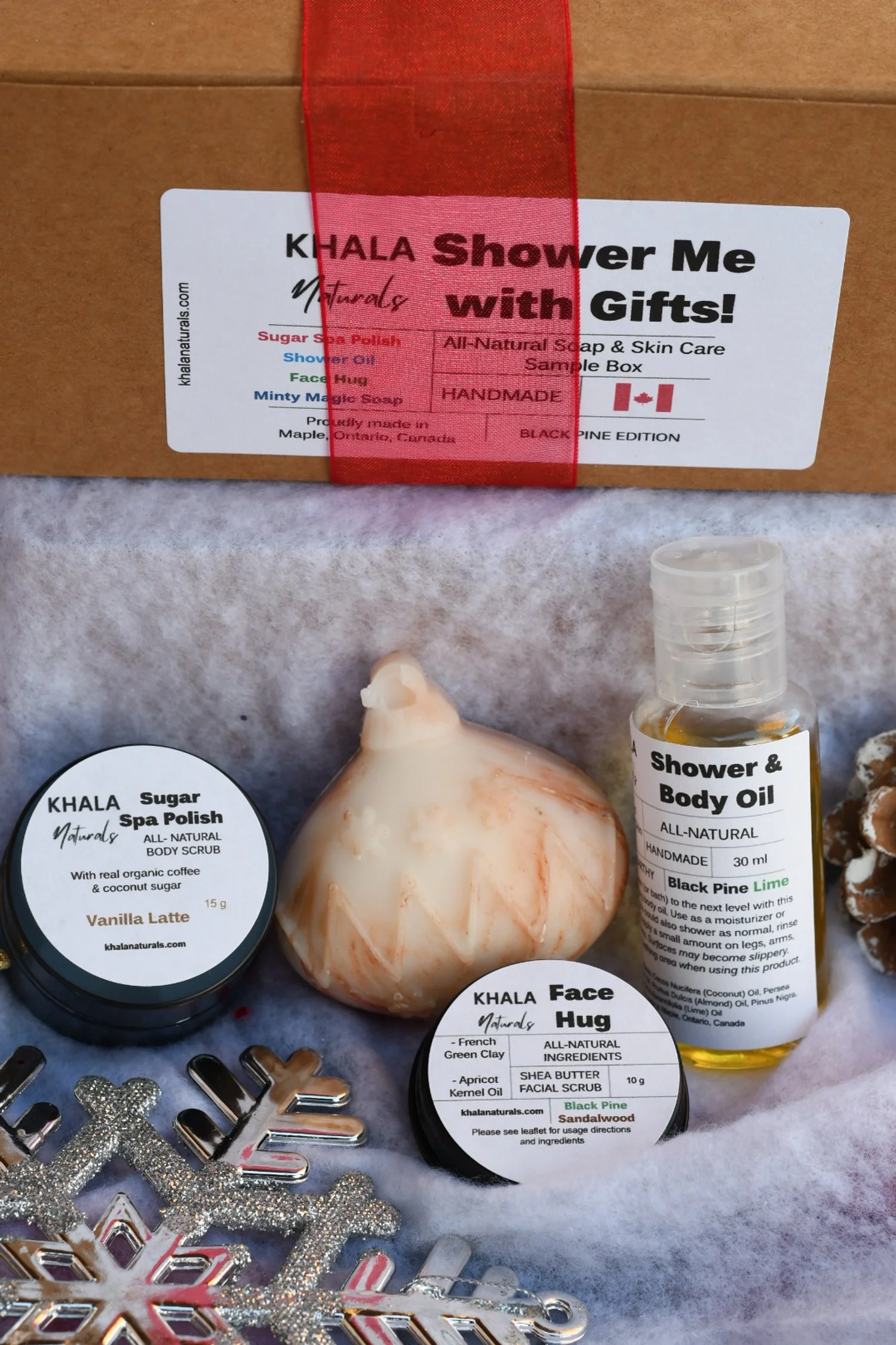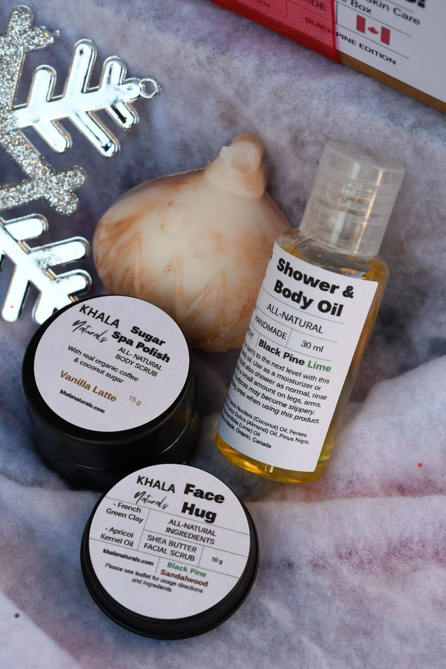Shower Oil: organic avocado oil, fractionated coconut oil, sweet almond oil, black pine and lime essential oils