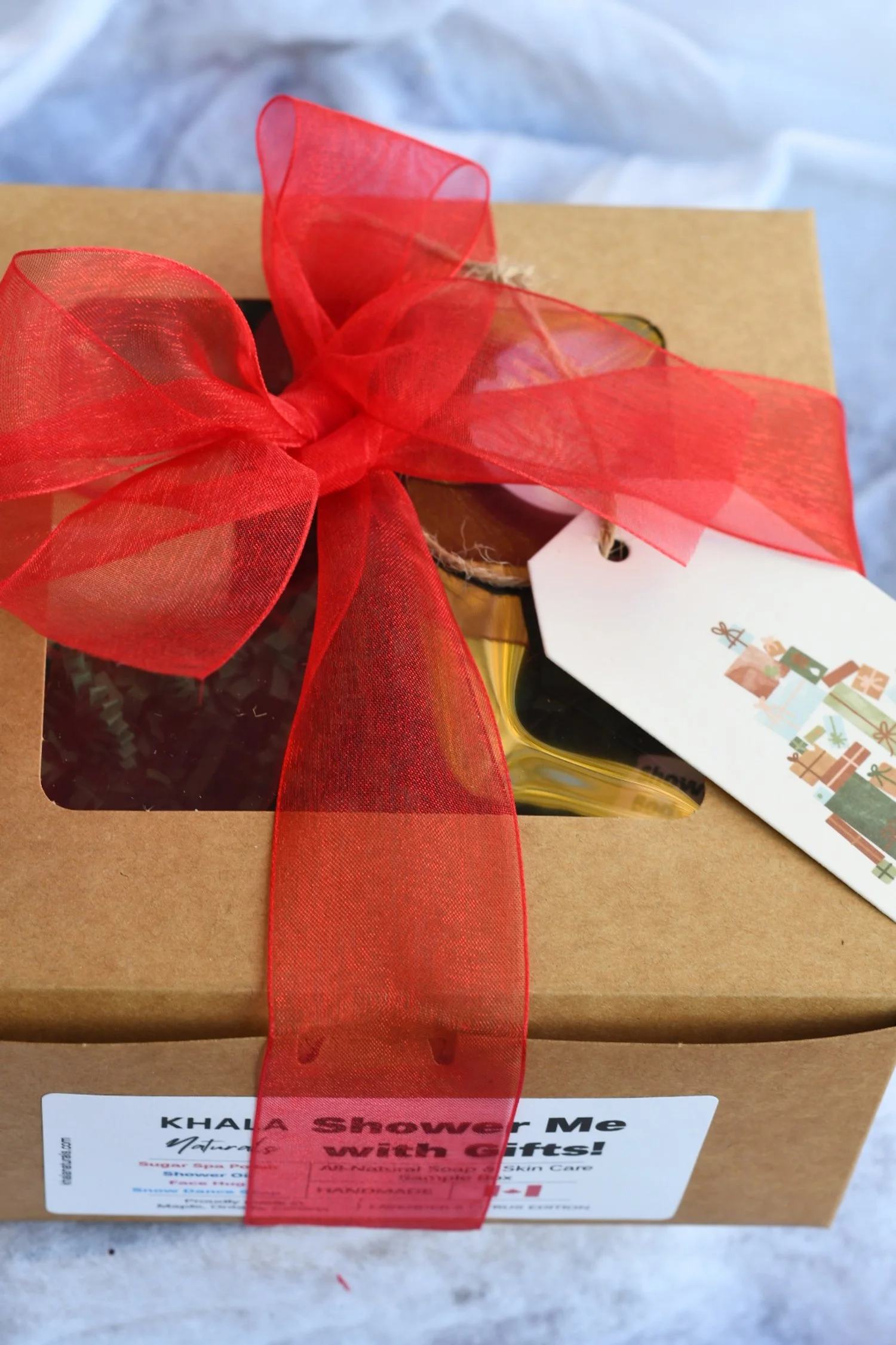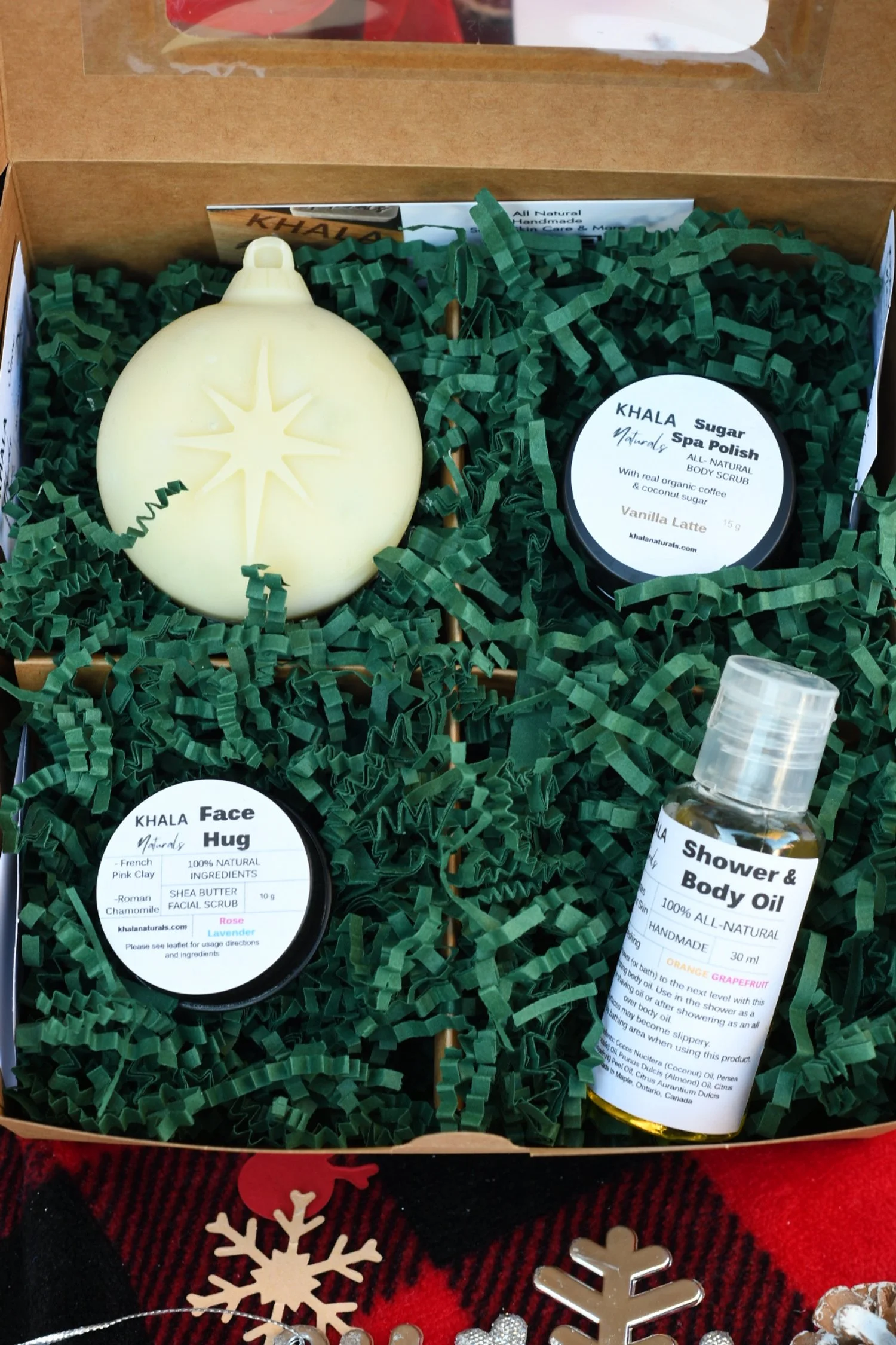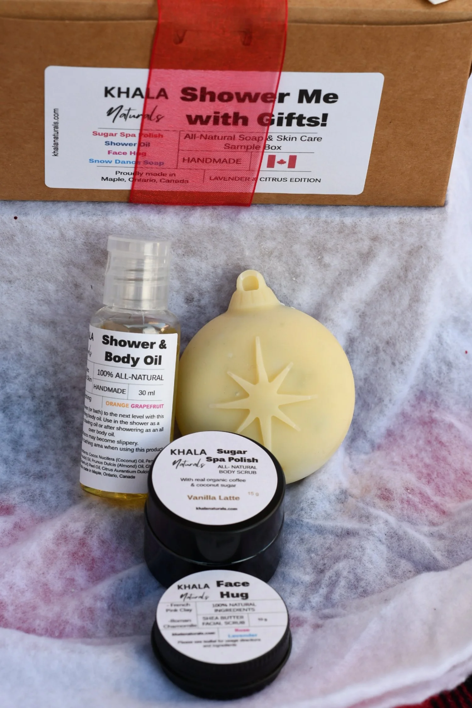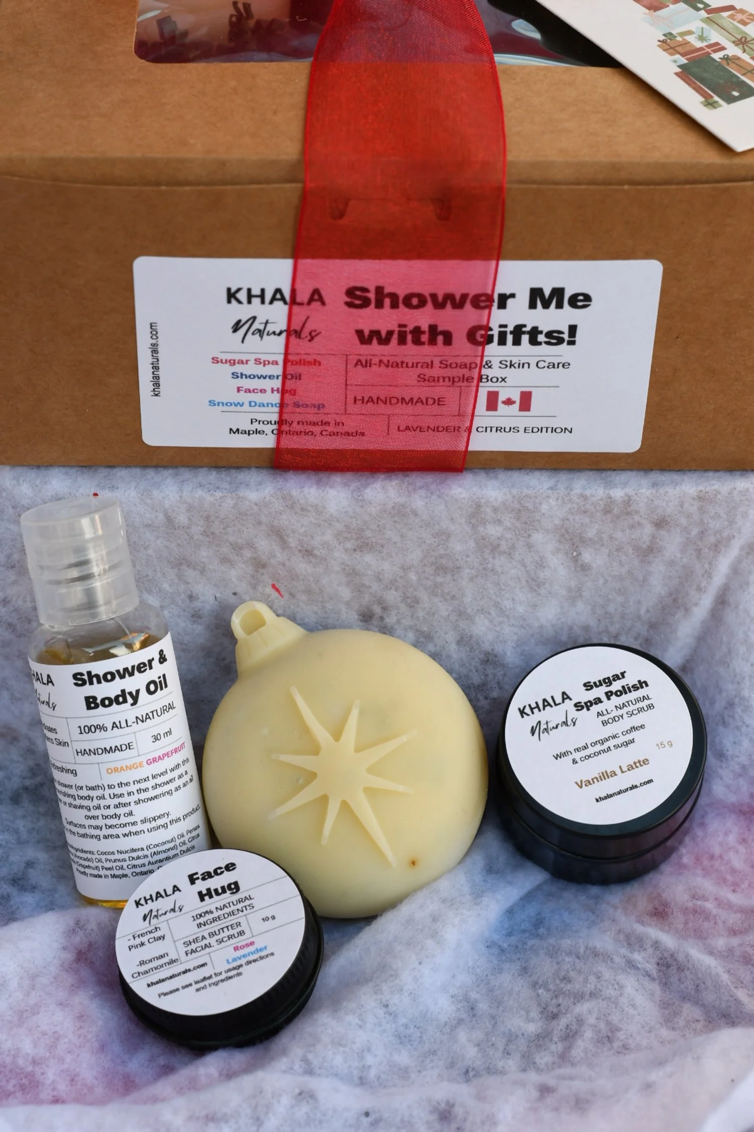 Shower Oil: organic avocado oil, fractionated coconut oil, sweet almond oil, orange 5-fold and white grapefruit essential oils