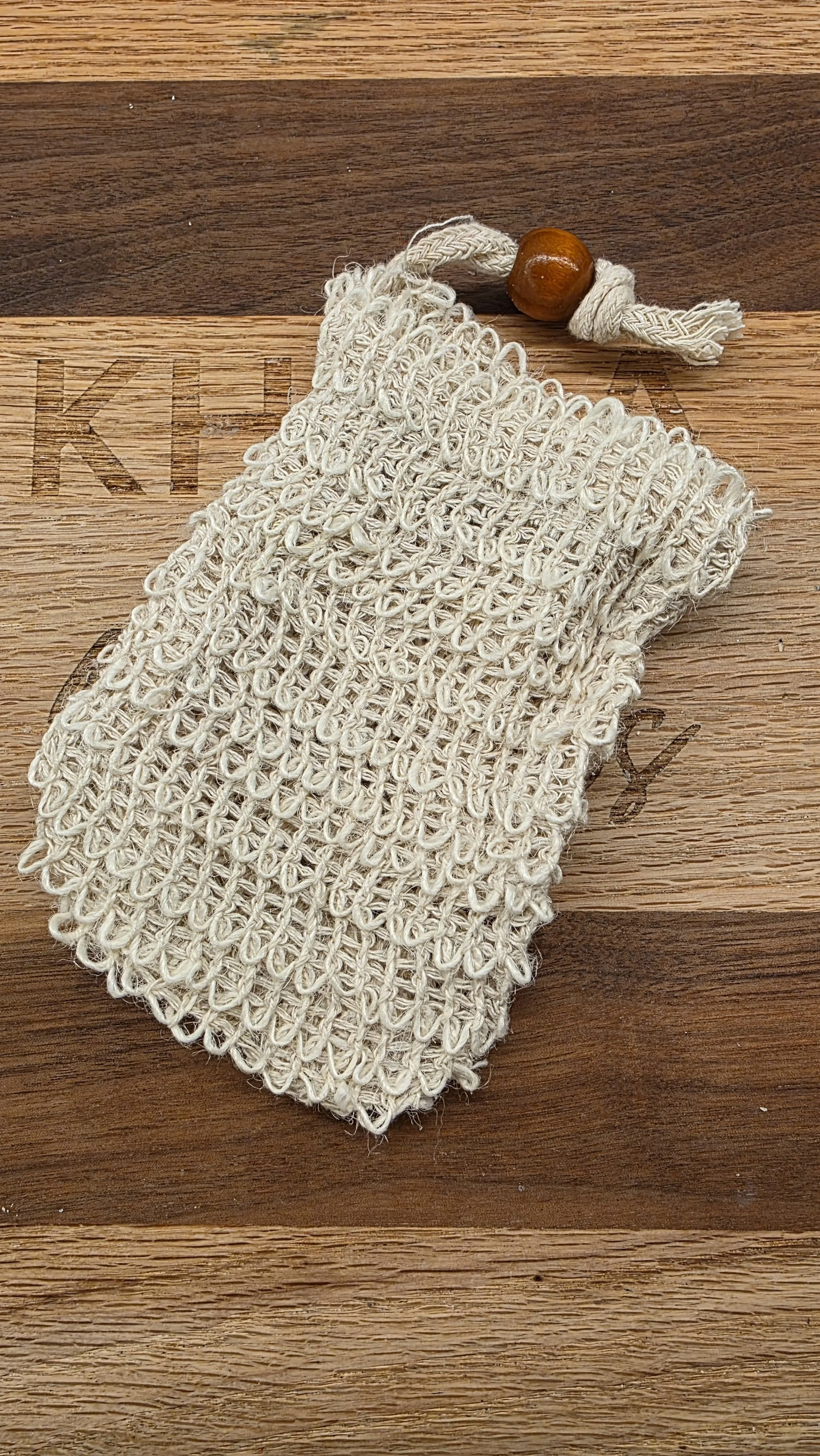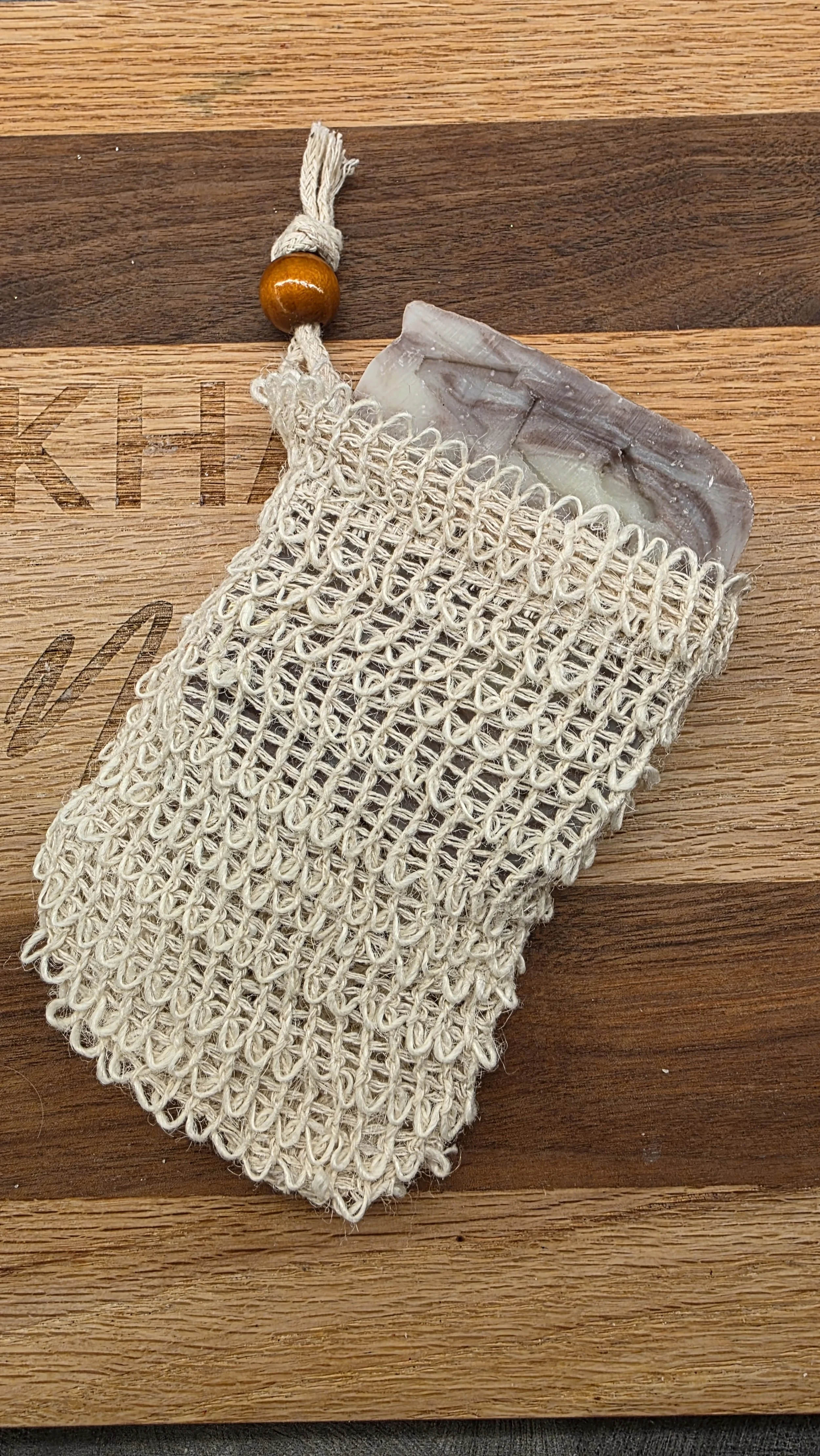 Fits any Khala Naturals soap easily and has a wooden bead detail on the drawstring.